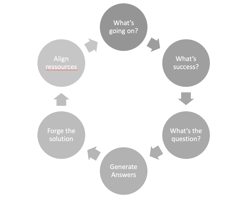 Um den Kern eines Problems zu erfassen, beginnt das Productive Thinking Model mit der Frage “Was ist los?”. Dieser Schritt fordert die dich auf, den Status quo zu hinterfragen und zu verstehen, bevor sie vorschnelle Schlüsse ziehen. Es geht darum, den Kontext zu erfassen, die richtigen Fragen zu stellen und die Situation aus verschiedenen Blickwinkeln zu betrachten. Im Produktmanagement bedeutet dies, Kundenfeedback, Marktdaten und interne Metriken genau zu analysieren, um ein tiefes Verständnis der aktuellen Herausforderungen zu entwickeln.